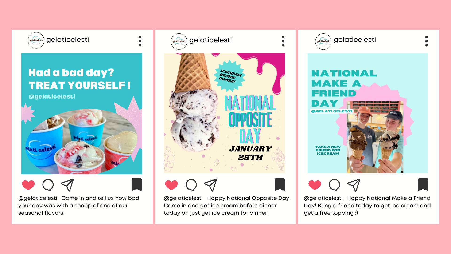 We used playful, timely social prompts—like National Opposite Day and “Treat Yourself” moments—to spark spontaneous ice cream runs and create new occasions to crave Gelati Celesti.